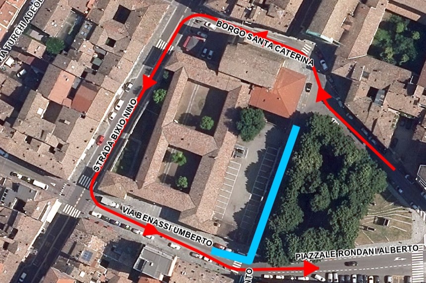 "text": "I veicoli che abitualmente transitano nel lato del piazzale interessato dai lavori saranno deviati su borgo Santa Caterina, strada Bixio e via Benassi."